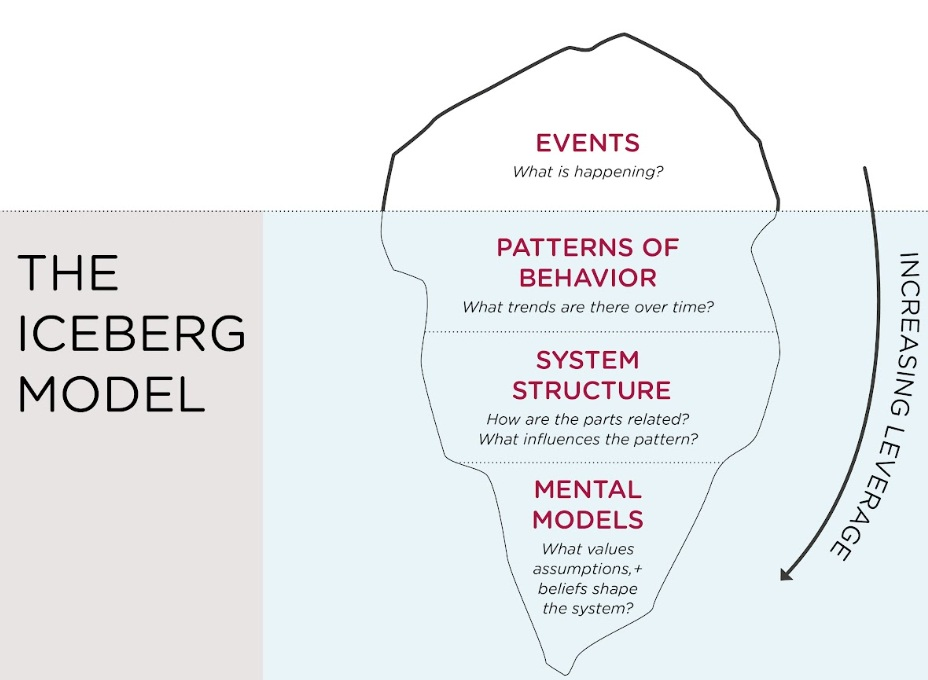 More recently, I have incorporated the “Iceberg Model” into helping prioritize donation decisions. I learned about this model from workshops at the Gandhi Institute; it is a framework that helps connect events and phenomena to their deeper underlying roots. The closer to the base of the iceberg, the greater the leverage for change. Because the Gandhi Institute is working at the level of mental models (i.e. nonviolence), it is a high-priority organization for our family’s donations.