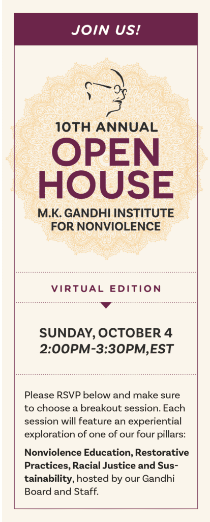 Join us to learn more about the Gandhi Institute and our initiatives. Choose one of our pillars to hear about our projects in that area. We are excited to bring the Gandhi Institute to you in these times of virtual learning and social distancing!