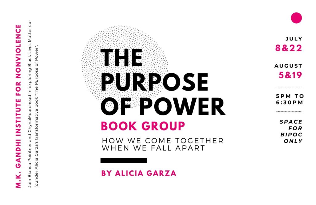 Join Bianca Pointner and Chyna Moorehead in exploring Black Lives Matter co-founder Alicia Garza’s transformative book “The Purpose of Power”. This space is intentional for BIPOC only. If you have any questions feel free to reach out to bianca@gandhiinstitute.org