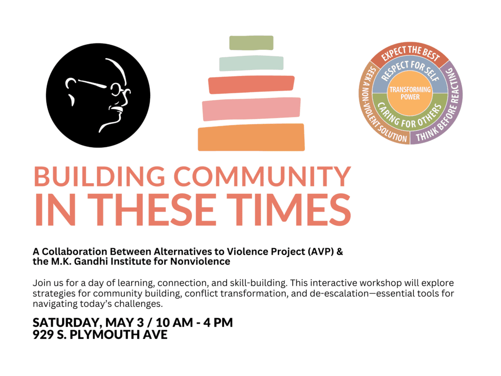 Join the Alternatives to Violence Project (AVP) and the M.K. Gandhi Institute for Nonviolence for a dynamic, hands-on workshop focused on building community, transforming conflict, and practicing de-escalation. Through interactive exercises and shared learning, we’ll explore essential skills for fostering connection and navigating today’s challenges with greater resilience.