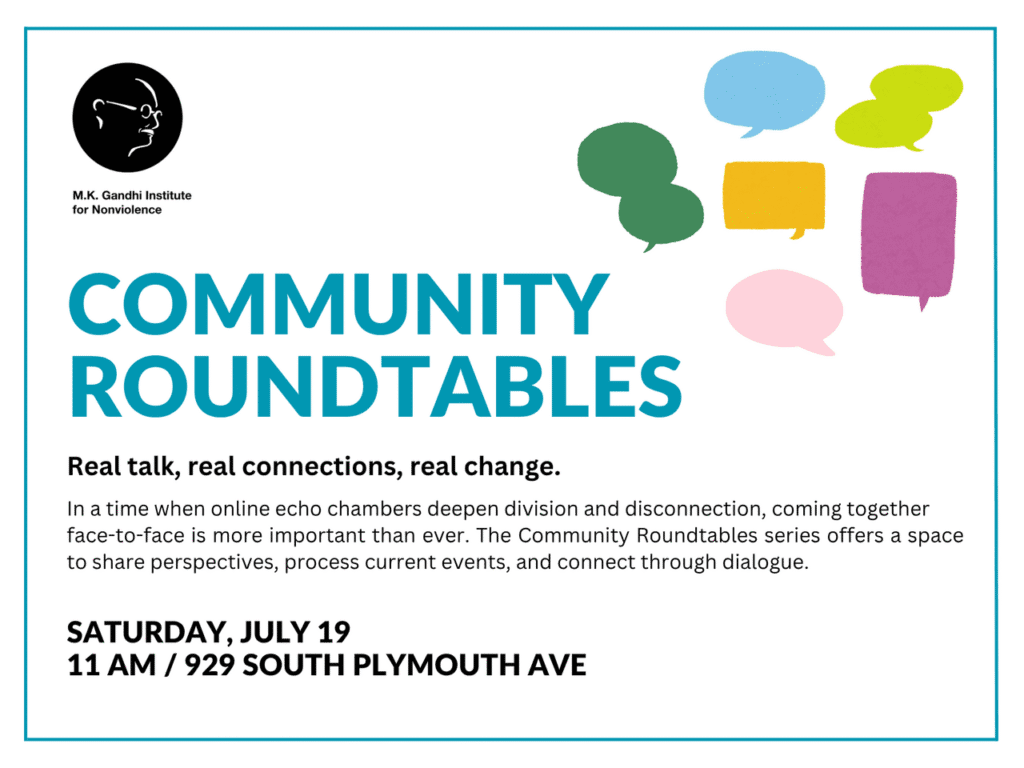 Each session will focus on open dialogue or specific topics that matter to the Rochester community—some selected by Gandhi Institute staff and others chosen by participants based on pressing issues and events. Through open conversation, we cultivate understanding and plant the seeds for collective action—whether by strengthening existing efforts or inspiring new initiatives. Join us as we listen, reflect, and build a more connected community.