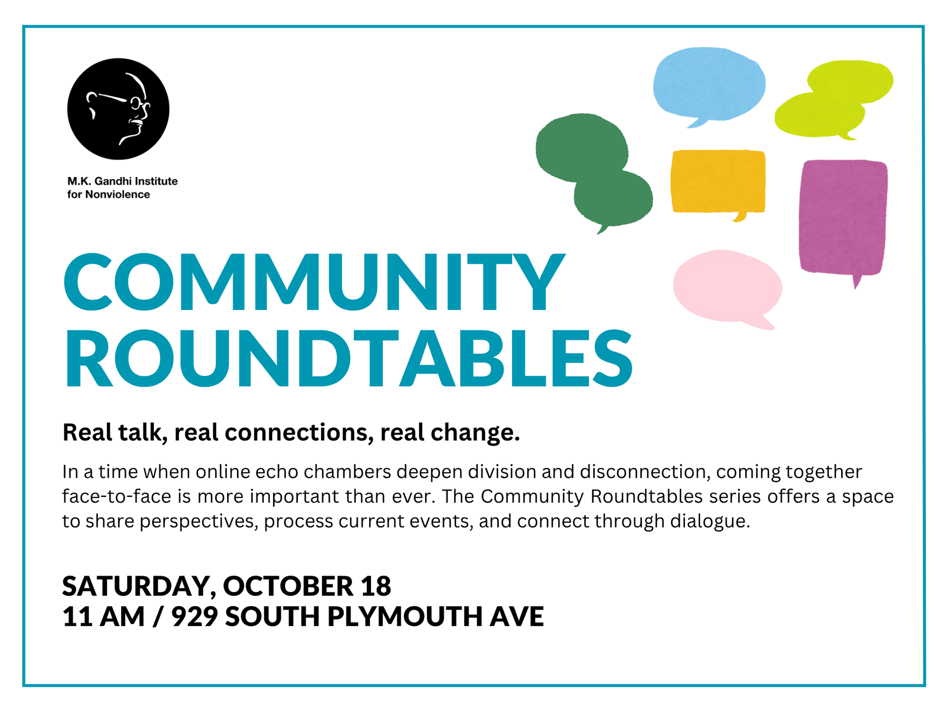 Each session will focus on open dialogue or specific topics that matter to the Rochester community—some selected by Gandhi Institute staff and others chosen by participants based on pressing issues and events. Through open conversation, we cultivate understanding and plant the seeds for collective action—whether by strengthening existing efforts or inspiring new initiatives. Join us as we listen, reflect, and build a more connected community.