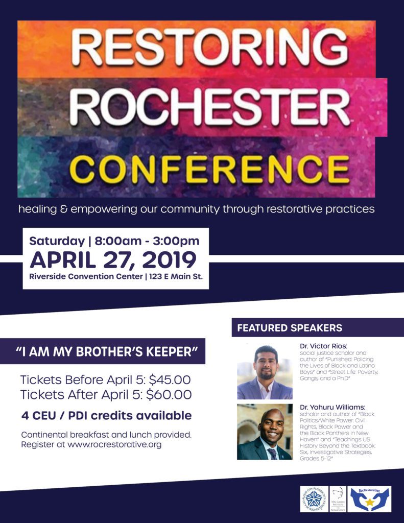 Restoring Rochester is sponsored in partnership with the M.K. Gandhi Institute for Nonviolence, ROC Restorative Team from the Rochester City School District, the City of Rochester and My Brother’s Keeper Challenge Grant.
