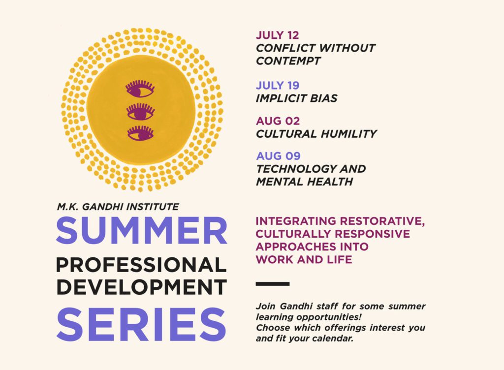 Looking to incorporate restorative and culturally responsive techniques into your work and personal life? Join Gandhi Institute staff and board this summer for one or more of the following learning opportunities!