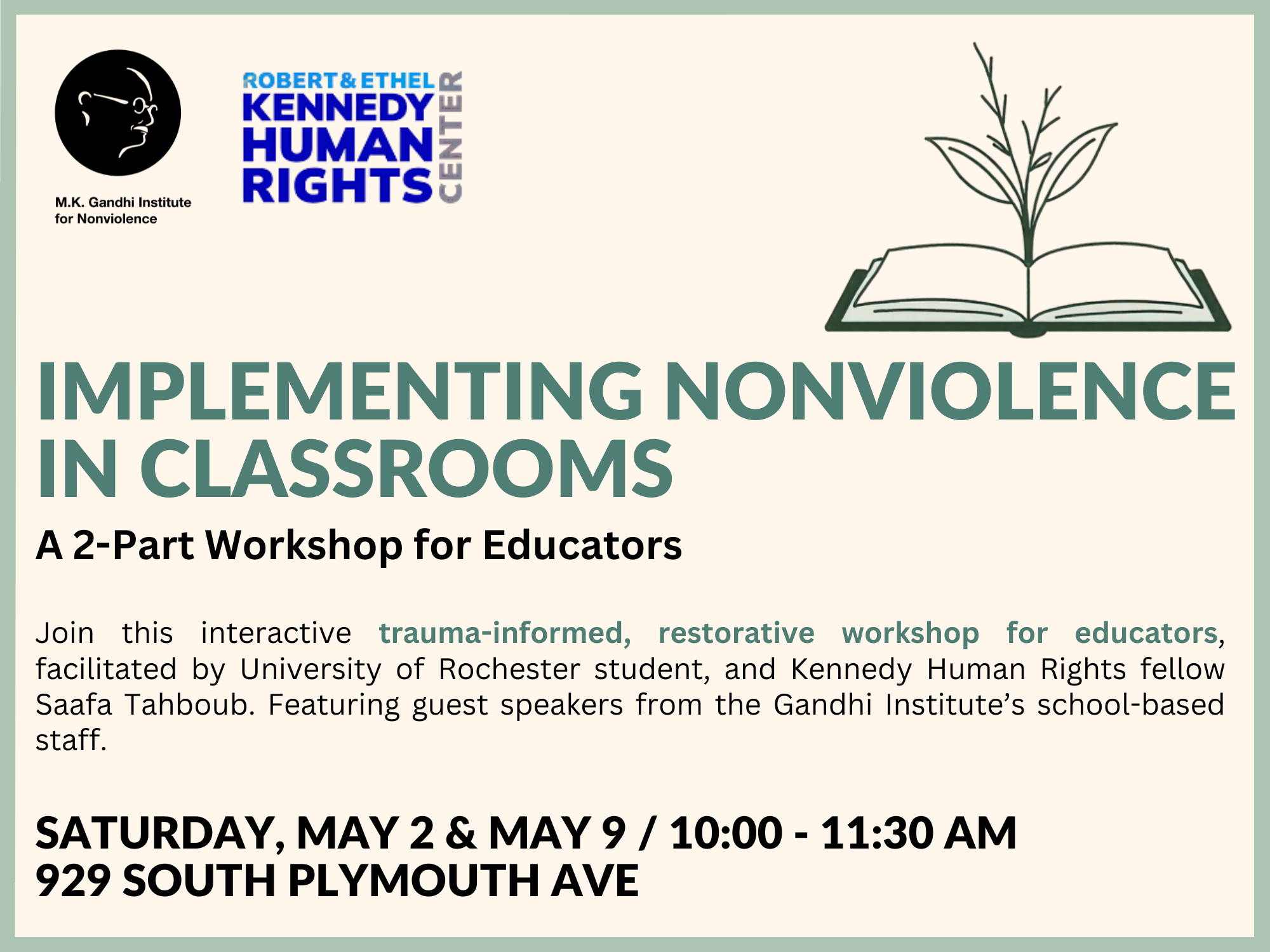 REGISTER Join this trauma-informed, restorative workshop for educators, facilitated by University of Rochester student, and Kennedy Human Rights fellow Saafa Tahboub. Featuring guest speakers from the Gandhi Institute’s school-based staff, […]