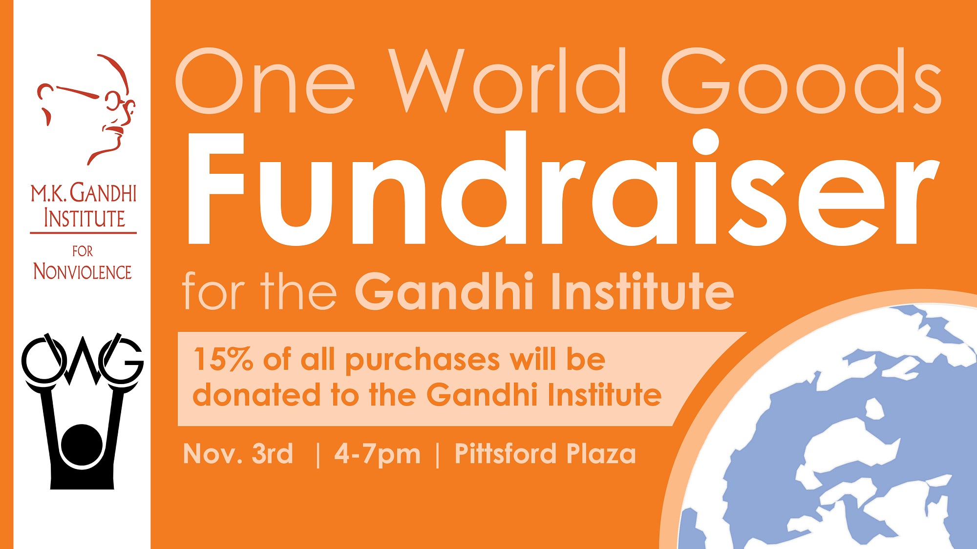 Looking for unique home decor or a meaningful gift? Want to support independent fair trade artisans from around the world while also helping out the Gandhi Institute? Then head over to One World Goods on Saturday, November 3rd! Between 4-7pm, 15% of all purchases made will be donated to the Gandhi Institute. ------------------------------------------------------------------------------------------- One World […]
